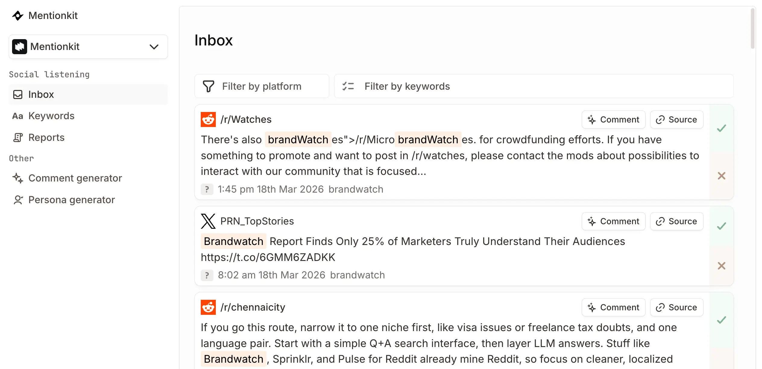 Mentionkit helps your team move from detected mention to posted reply in one place.